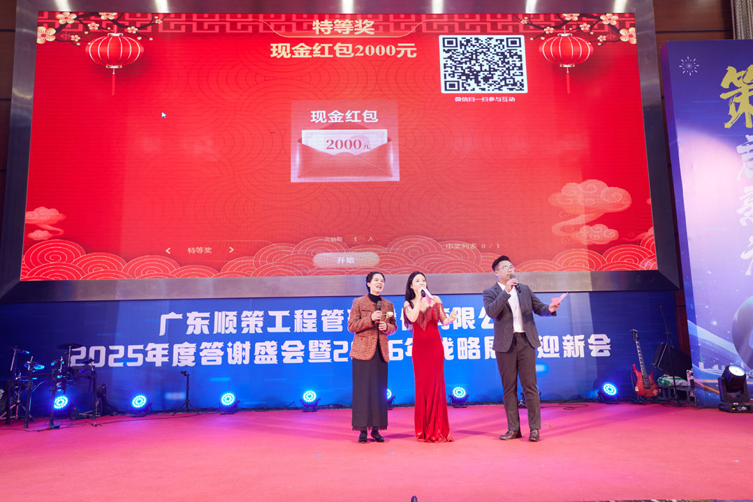 岁序更替,华章日新;欢聚一堂,共赴新程。2026 年1月25日,广东顺策工程管理股份有限公司 “2025 年度答谢盛会暨 2026 年战略展望迎新会” 盛大启幕,全体员工与特邀嘉宾齐聚一堂,在欢声笑语中盘点耕耘硕果,在凝心聚力中展望崭新征程。