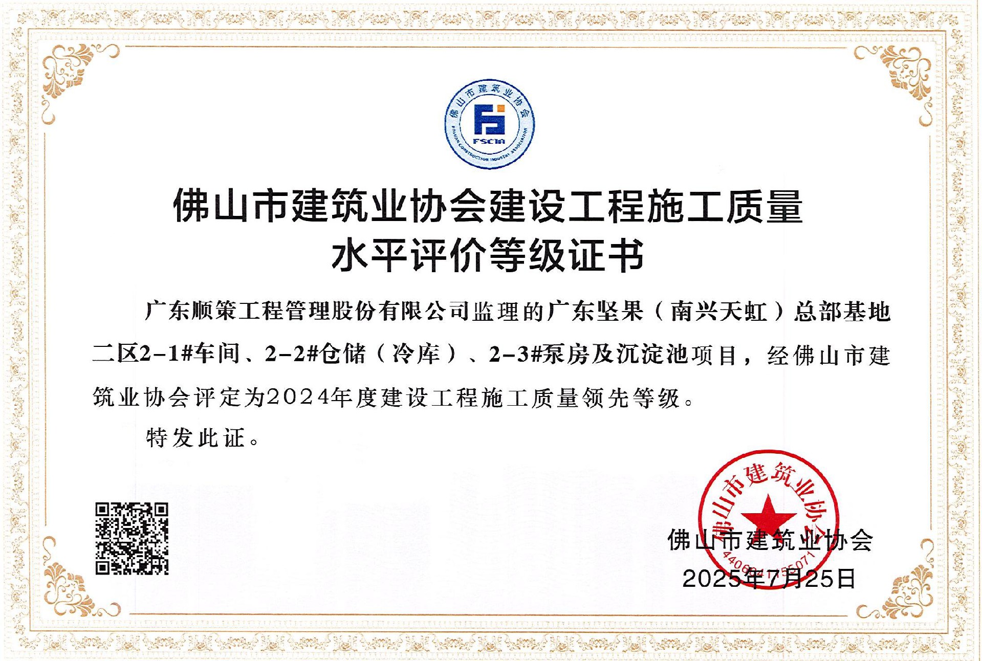 佛山市建筑业协会评定为2025年结构工程施工质量领先等级
